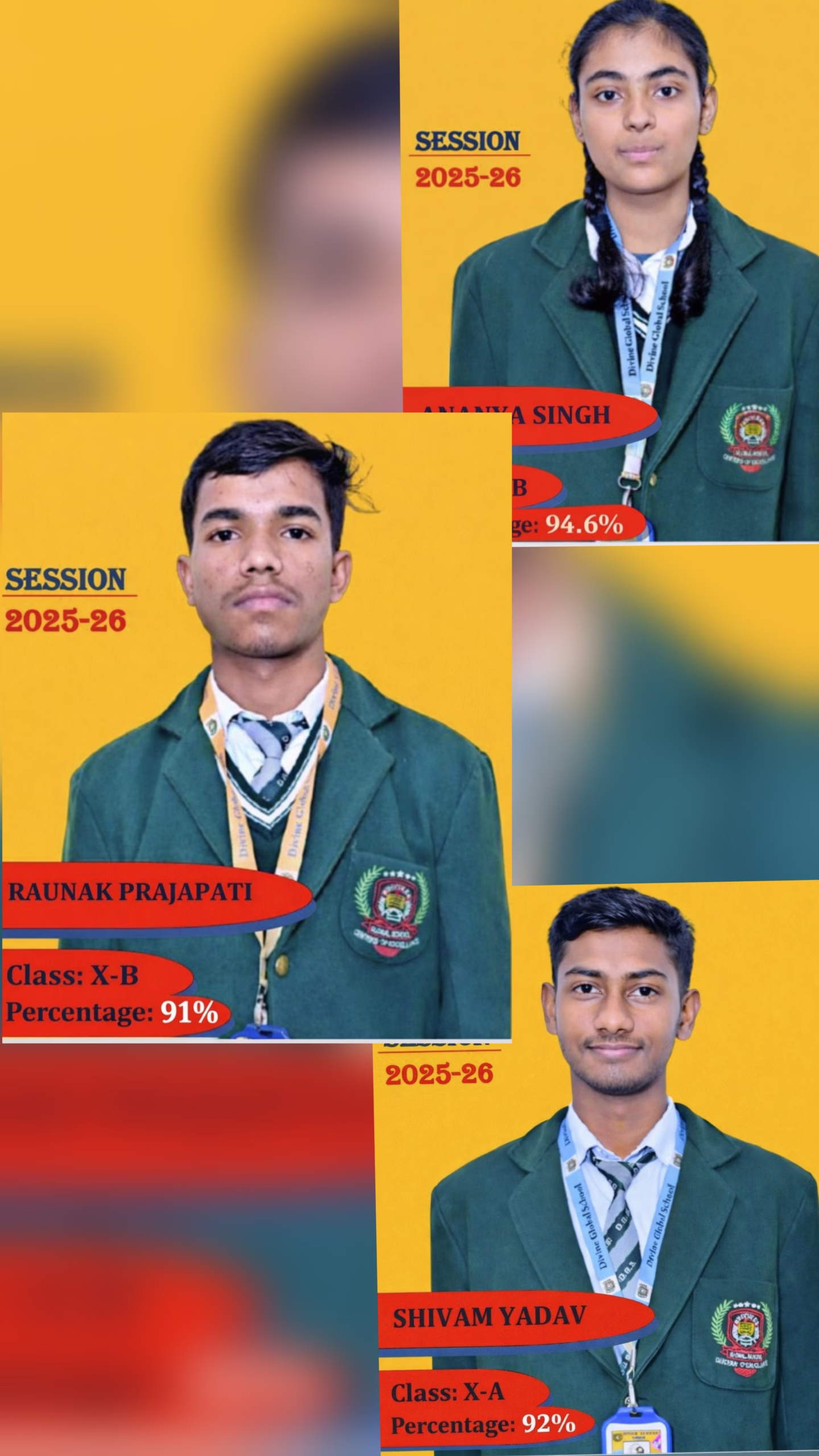 विद्यालय के परीक्षा परिणामों में अनन्या सिंह ने 94.6 प्रतिशत अंक प्राप्त कर प्रथम स्थान हासिल किया। शिवम सिंह यादव ने 92 प्रतिशत अंक प्राप्त कर द्वितीय स्थान प्राप्त किया, जबकि रौनक प्रजापति ने 91 प्रतिशत अंक अर्जित कर तृतीय स्थान पर अपना स्थान बनाया। विद्यालय के अन्य विद्यार्थियों का प्रदर्शन भी सराहनीय रहा, जिससे विद्यालय में हर्ष का माहौल व्याप्त है। इस सफलता पर विद्यालय के संस्थापक चेयरमैन श्री रामउग्रह सिंह, श्री अश्वनी सिंह, प्रबंधक श्री प्रकाश यादव, प्रधानाचार्या प्रियंका जी एवं रितु यादव सहित समस्त शिक्षक-शिक्षिकाओं ने प्रसन्नता व्यक्त की। विद्यालय प्रबंधन ने सभी सफल छात्र-छात्राओं को बधाई देते हुए कहा कि यह सफलता विद्यार्थियों के कठिन परिश्रम, अनुशासन एवं शिक्षकों के मार्गदर्शन का परिणाम है। साथ ही सभी विद्यार्थियों के उज्ज्वल भविष्य की कामना की गई।